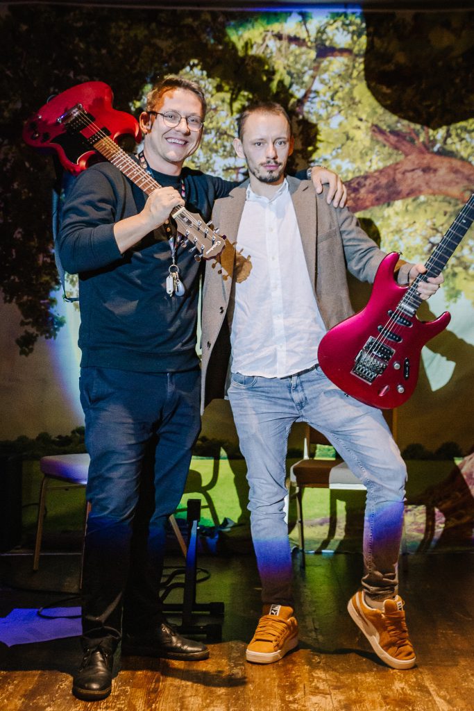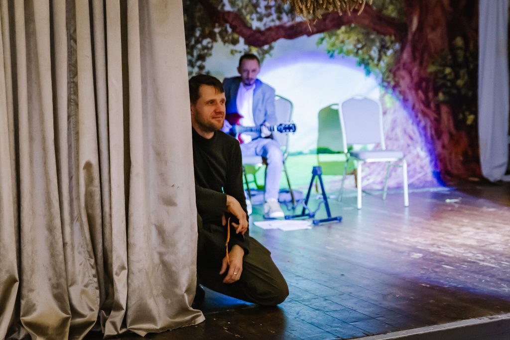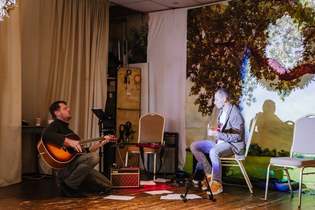 Po przerwie, gdy najmłodsi aktorzy ustąpili miejsca dorosłym, klub wypełnił się dźwiękiem gitar Pawła Młynarskiego i Ryśka. Viola i Tomek, prowadzący spotkanie, z wdziękiem połączyli słowa poety z komentarzami i wprowadzeniami do poszczególnych fragmentów utworów renesansowego humanisty.